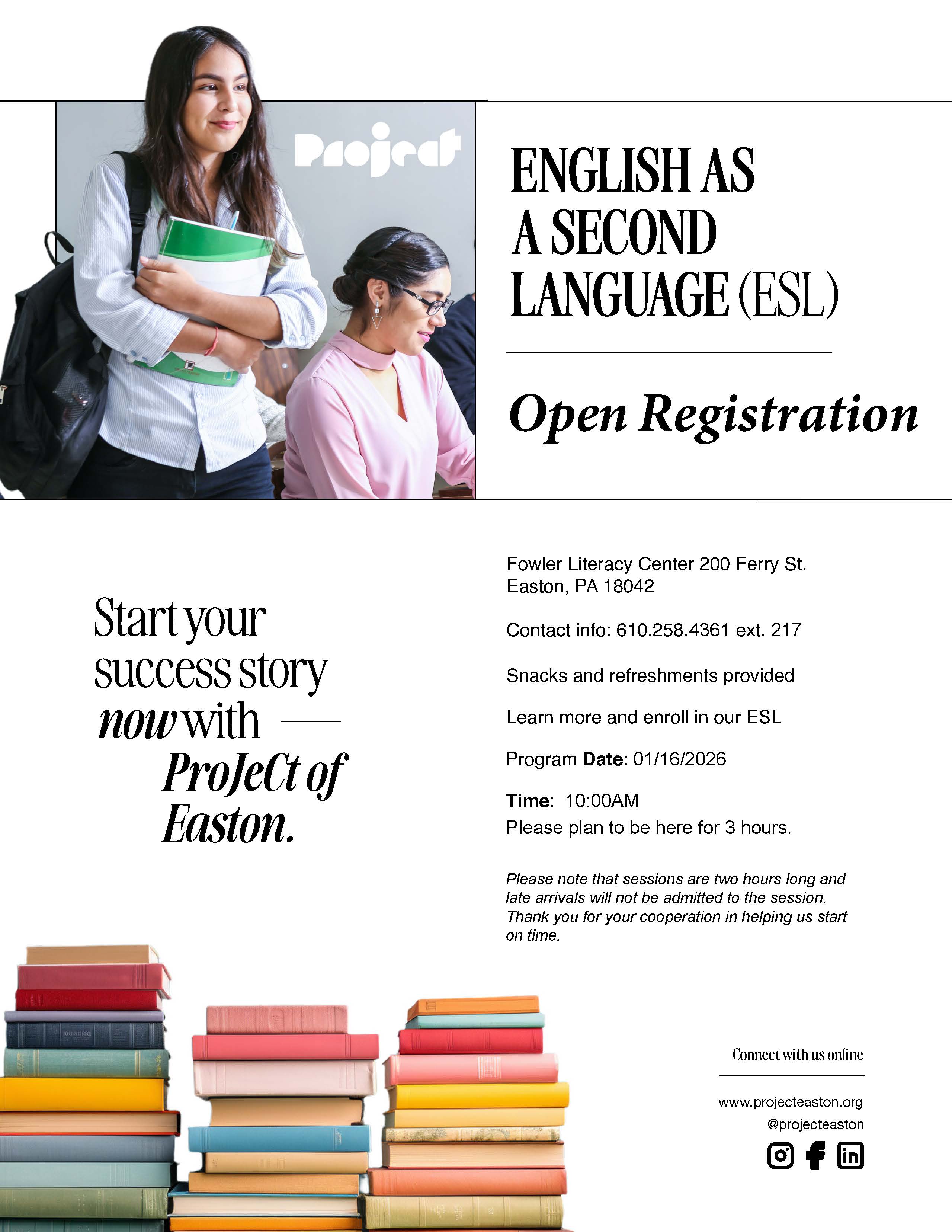 English as a Second Language (ESL): Instruction in English language skills for non-native speakers. Students learn English skills (reading, writing, and grammar), build their vocabulary, and increase conversation, listening comprehension, and life skills.